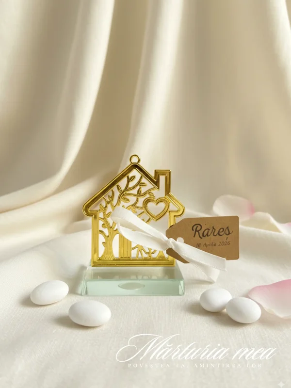 Alege o marturie casa familie botez care transmite emoție și apreciere. Realizată din metal auriu și montată pe suport de sticlă, această decorațiune în formă de casă cu silueta unei familii și inimă decupată este mai mult decât un simplu obiect – este o amintire de suflet, păstrată cu drag de invitați.